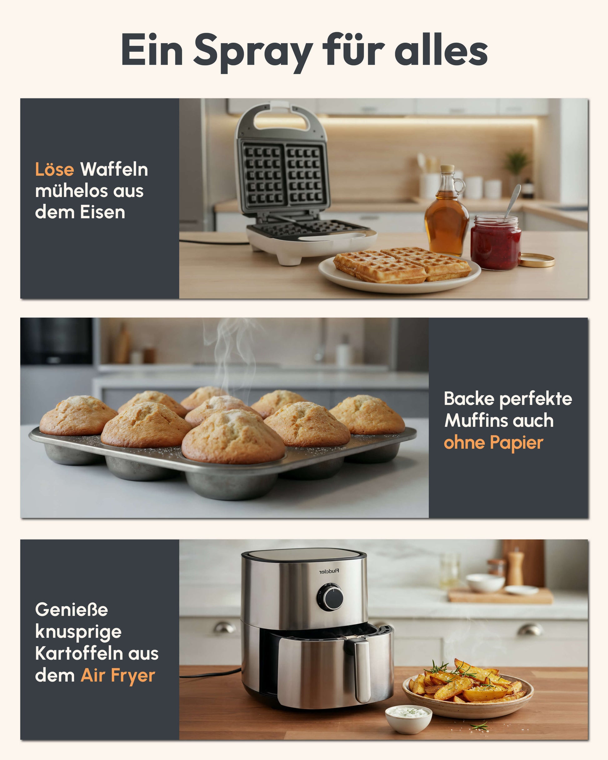 Mit dem GoodBake Backtrennspray fettest Du Backformen, Waffeleisen, Pfannen und viele weitere Küchenhelfer schnell, sauber und gleichmäßig ein. Die feine Sprühverteilung sorgt für eine dünne Schicht, damit sich Kuchen, Muffins, Brote oder herzhafte Speisen leichter lösen und weniger anhaften.