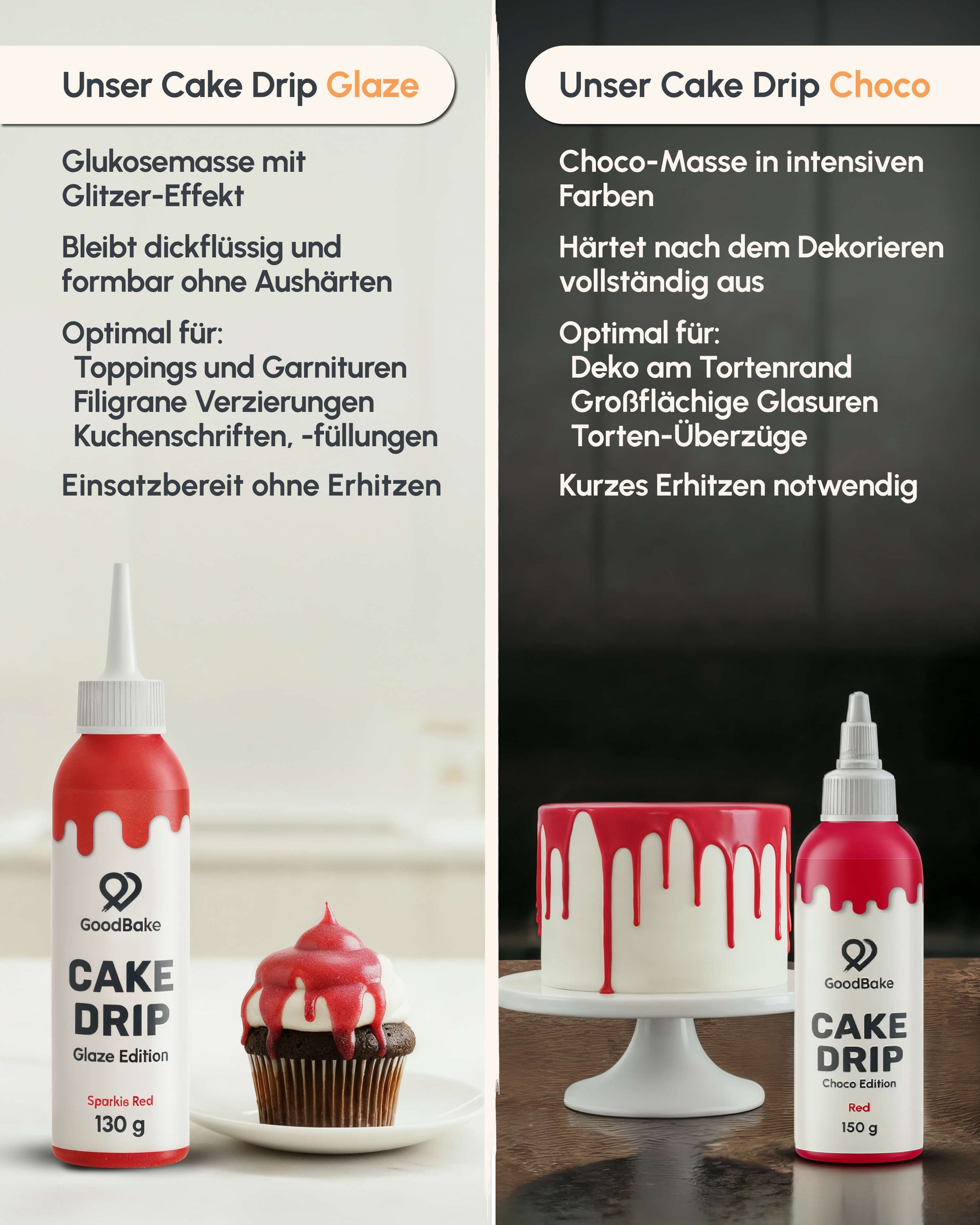 Der Choco Drip wird in der Regel erwärmt, damit er flüssig genug zum Auftragen ist, und härtet nach dem Dekorieren aus. Der Glaze Drip dagegen ist sofort anwendungsfertig, bleibt weich und sorgt für ein glänzendes, geschmeidiges Finish.