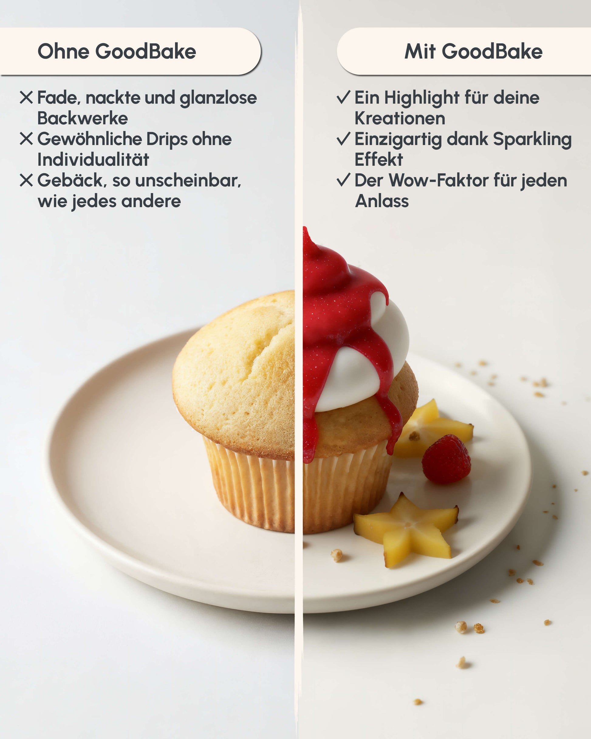 Mit dem GoodBake Cake Drip Glaze verleihst Du Torten, Cupcakes, Keksen und Desserts im Handumdrehen ein glänzendes Finish. Die Glukose-Glasur ist sofort einsatzbereit, lässt sich sauber dosieren und eignet sich perfekt für feine Verzierungen, Toppings und dekorative Schriftzüge.