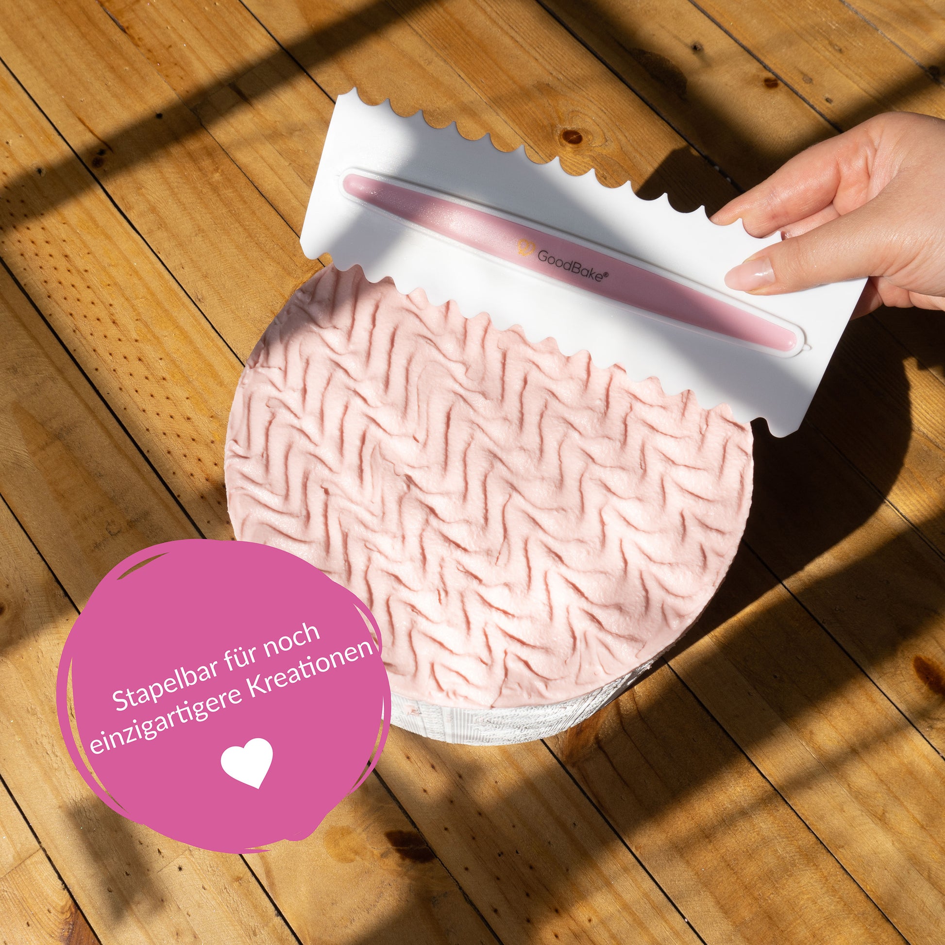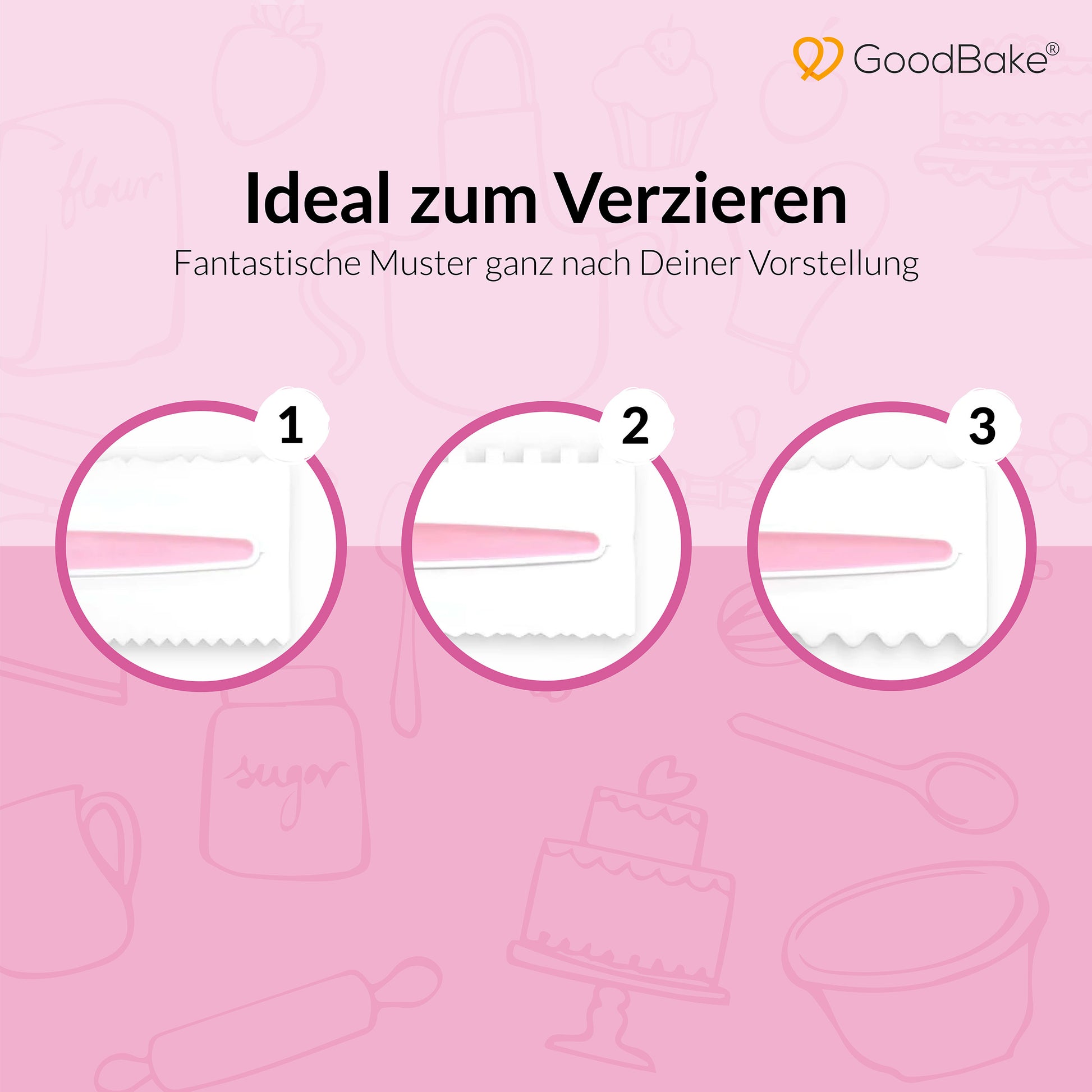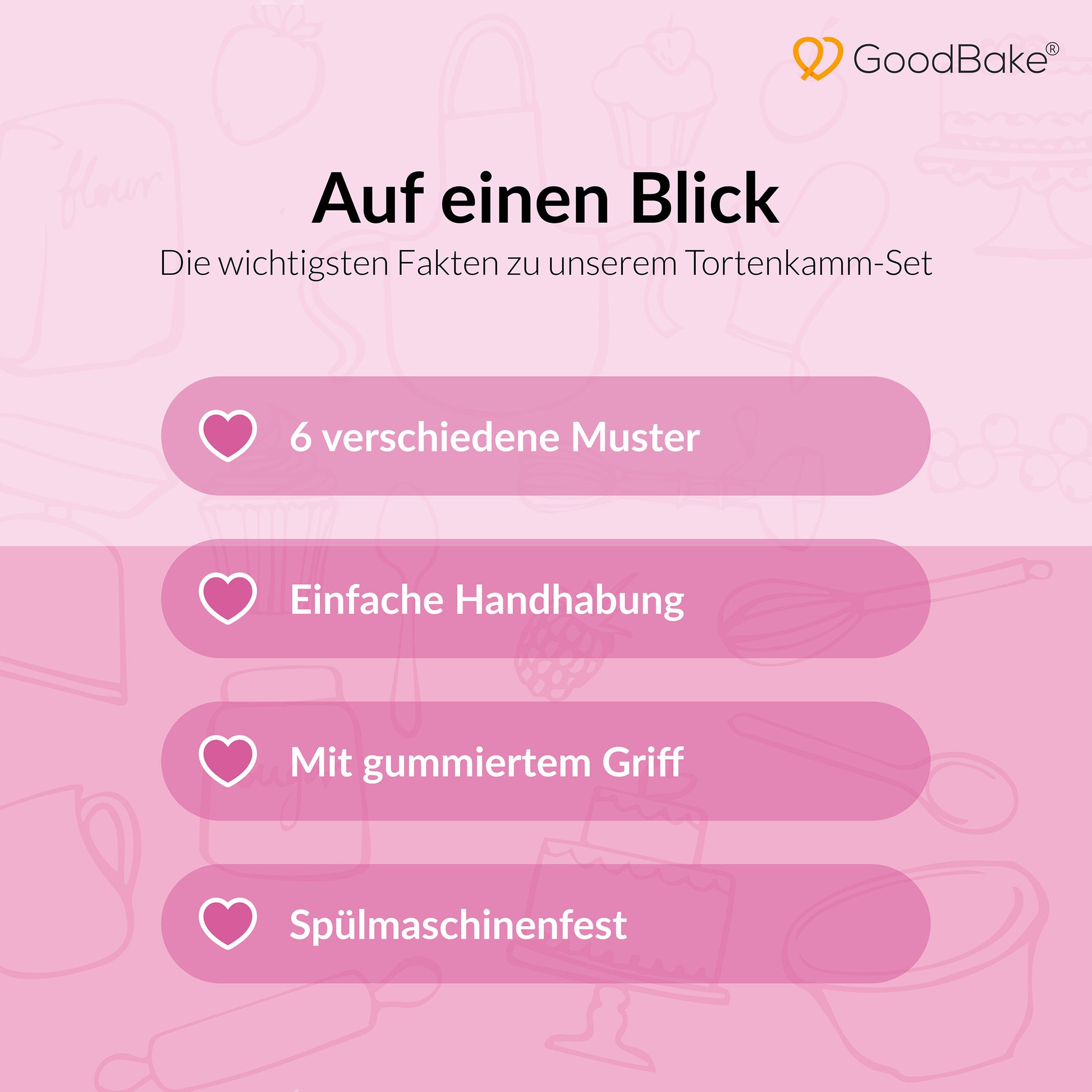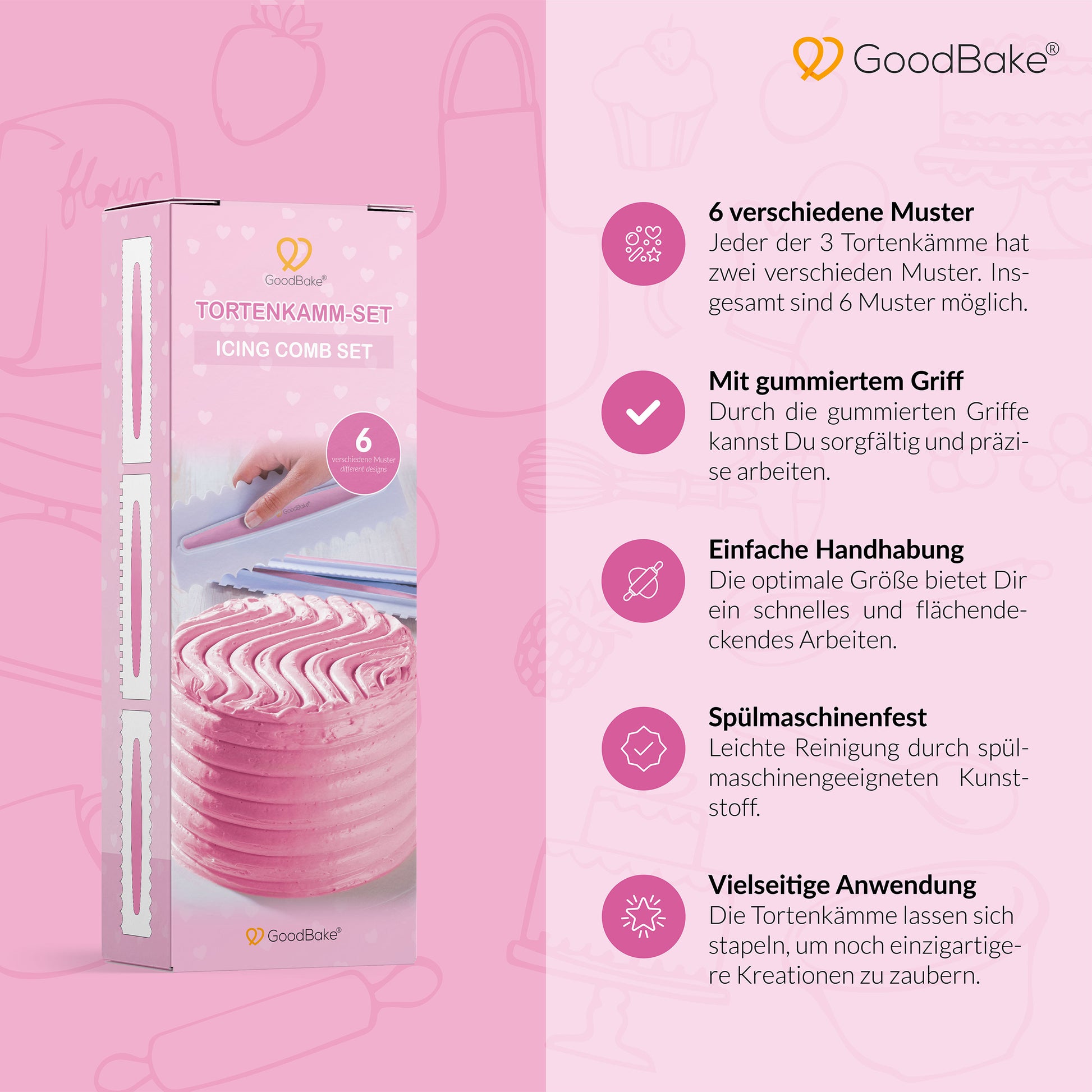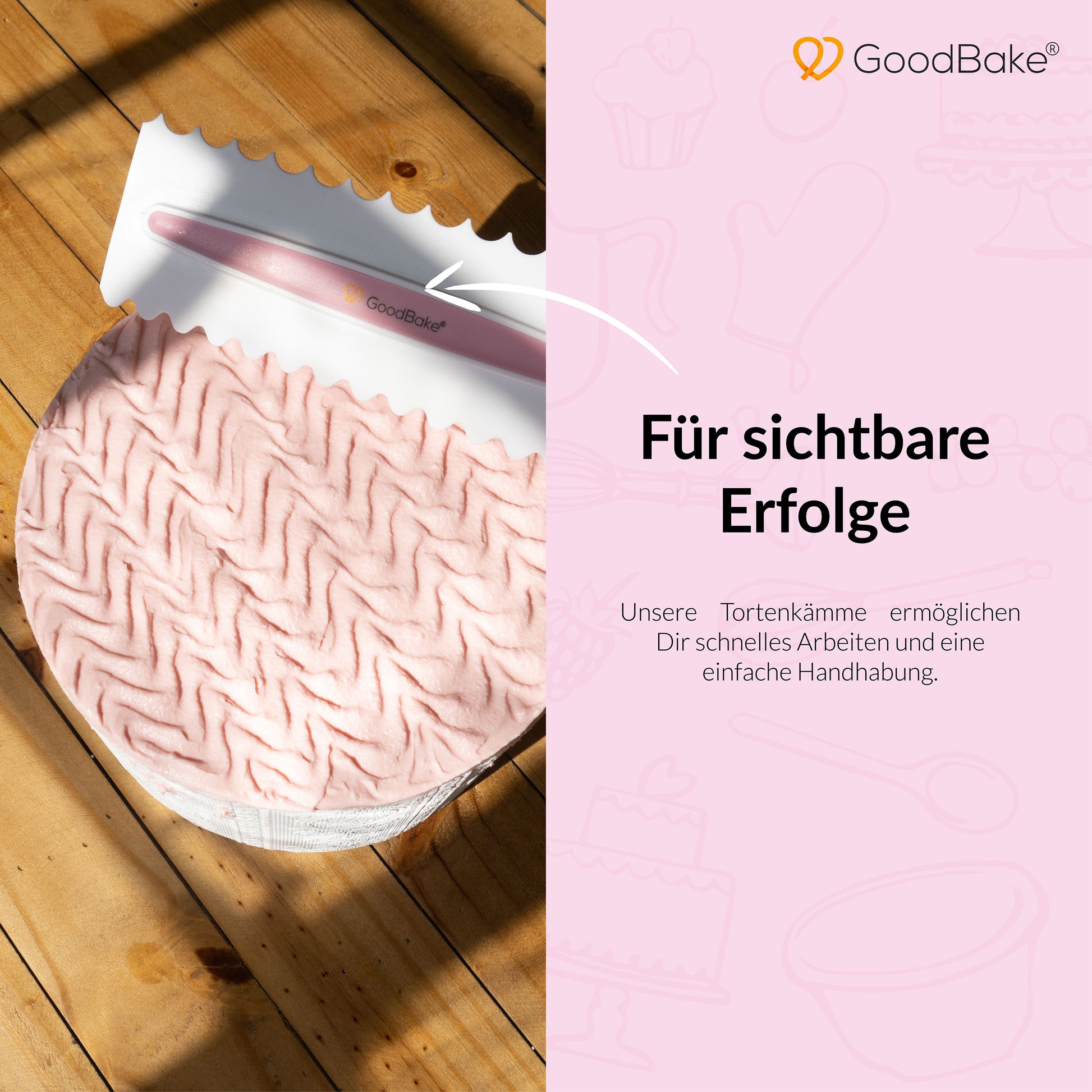 - Ideal zum Verzieren! Mit unseren GoodBake Tortenkämmen lassen sich faszinierende Muster auf Torten und Kuchen zaubern. Lege unsere Tortenkämme einfach an eine mit Buttercreme, Frosting, Icing, Sahne oder Ganache bestrichenen Torte an und ziehe sie für ein wunderbares Muster einmal über die Oberfläche. Am besten funktioniert dieses Vorgehen, wenn Deine umwerfende Torte auf einer drehbaren Tortenplatte steht.